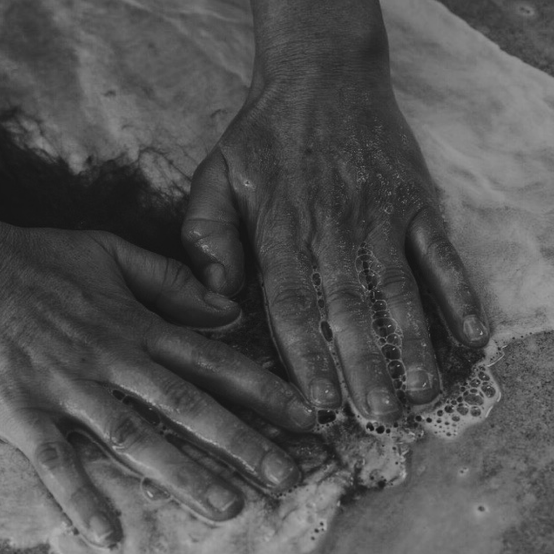 Base en el fieltro húmedo | Utilizamos la técnica del Nuno Felting para la creación de nuestros fulares. Esta técnica parte del proceso tradicional de fieltro húmedo, en el cual las fibras de lana se entrelazan y compactan bajo condiciones de humedad y fricción. Este paso inicial es fundamental para la calidad y durabilidad de nuestas piezas.